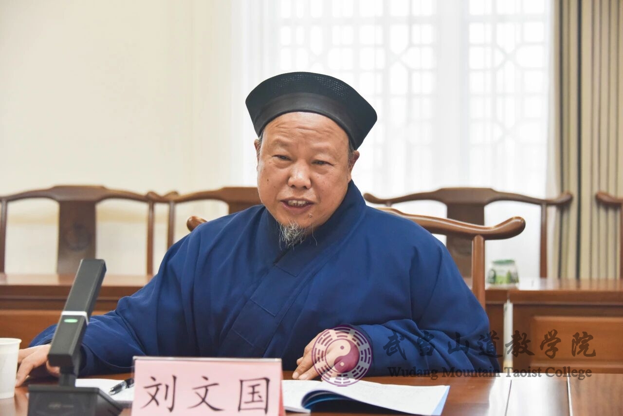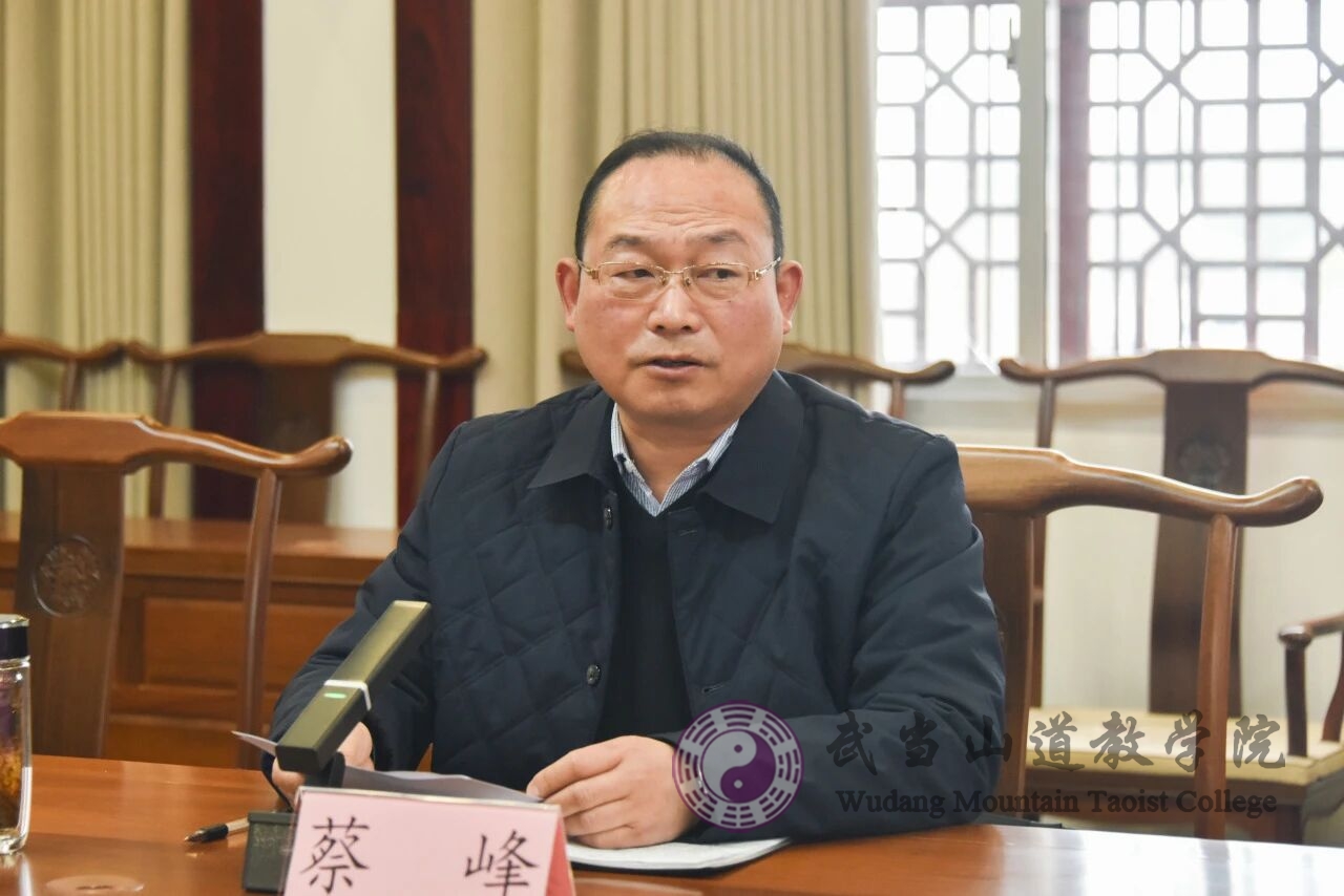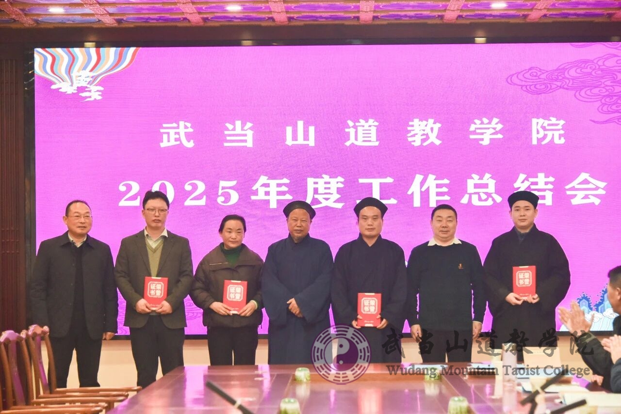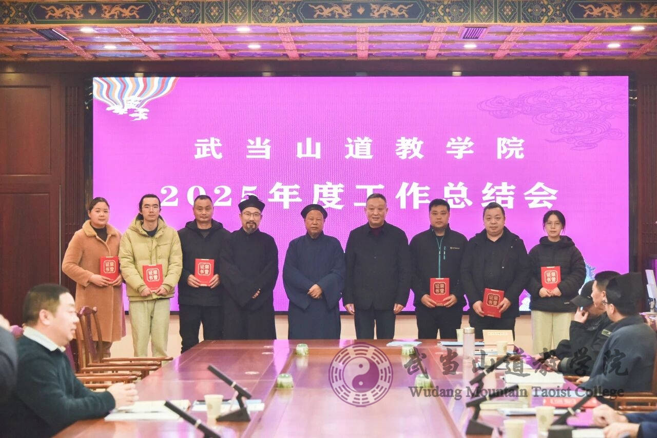 12月24日,武当山道教学院召开2025年度工作总结会。十堰市宗教事务服务中心主任蔡峰、丹江口市宗教团体服务中心主任陈迪燚,武当山道教协会会长、道教学院院长刘文国,常务副院长葛立刚,副院长雷金学及全院教职员工参会。会议由常务副院长葛立刚主持。